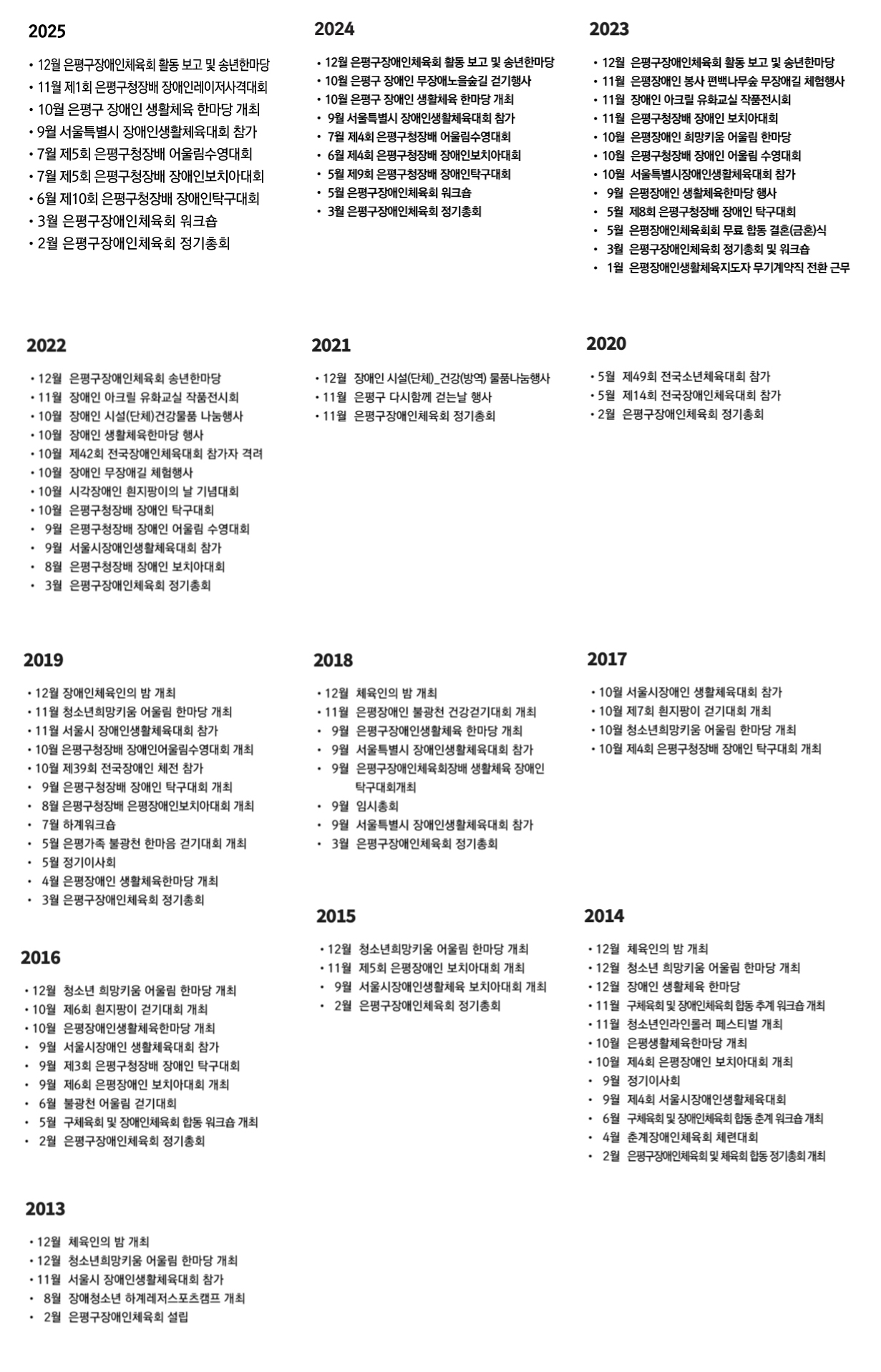 은평구장애인체육회는 장애인의 건강증진과 건전한 여가생활 진작을 위한 생활체육의 활성화와 종목별 체육단체 및 장애유형별 체육단체의 육성지원을 통해 은평구 장애인체육활성화에 기여함을 목적으로 한다.